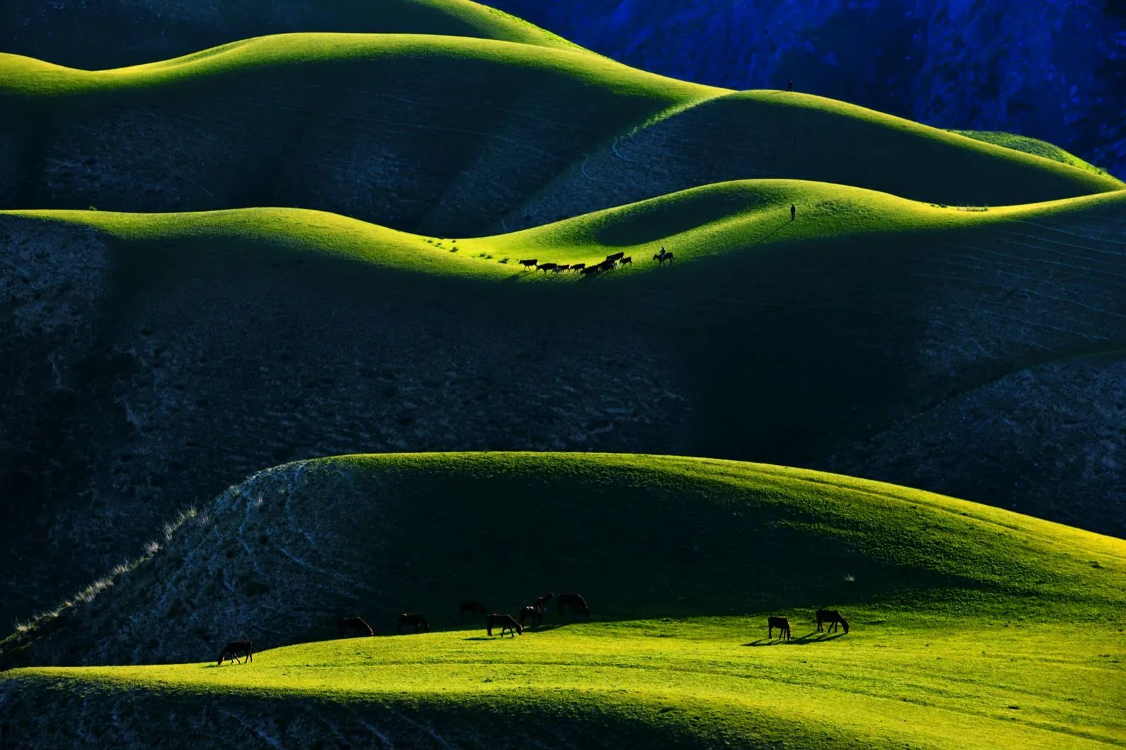 早上繼續(xù)拍攝賽里木湖,后拍攝果子溝大橋,經(jīng)伊寧、特克斯縣,后前往拍攝【闊克蘇峽谷草原人體曲線、九曲十八彎】。