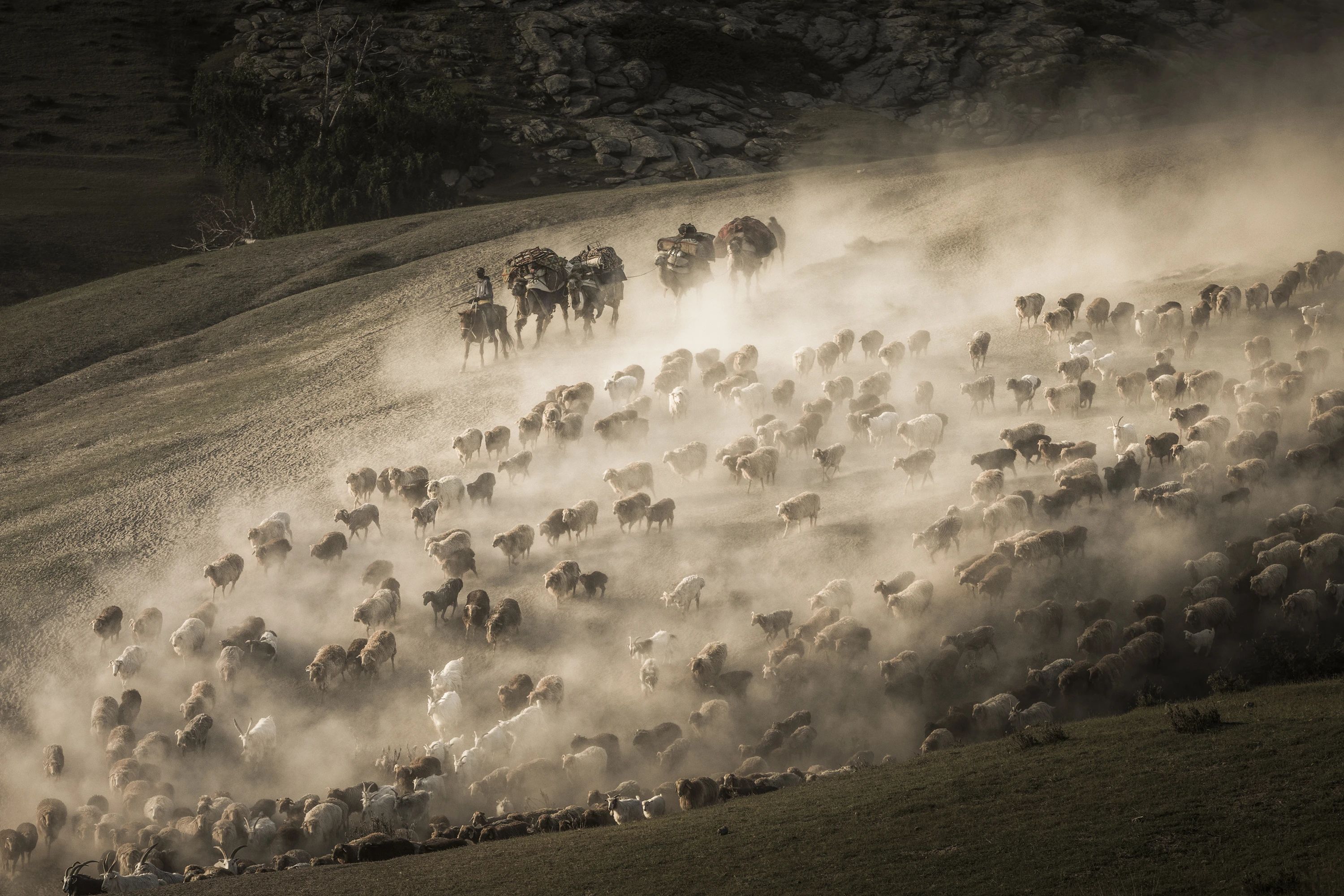 6月初,哈薩克族牧民攜家?guī)Э?,牽著載滿氈房、趕著大批成群結(jié)隊(duì)的牲畜如潮水般遷徙,從冬牧場(chǎng)轉(zhuǎn)入夏牧場(chǎng),一直會(huì)持續(xù)10天左右,上百萬牲畜一群接著一群,聲勢(shì)浩大地向著阿爾泰山深處 “遷徙”。這樣的傳統(tǒng)轉(zhuǎn)場(chǎng)生活已經(jīng)延續(xù)了近3000年左右,浩浩蕩蕩的遷徙大軍成了當(dāng)?shù)氐囊坏里L(fēng)景線.