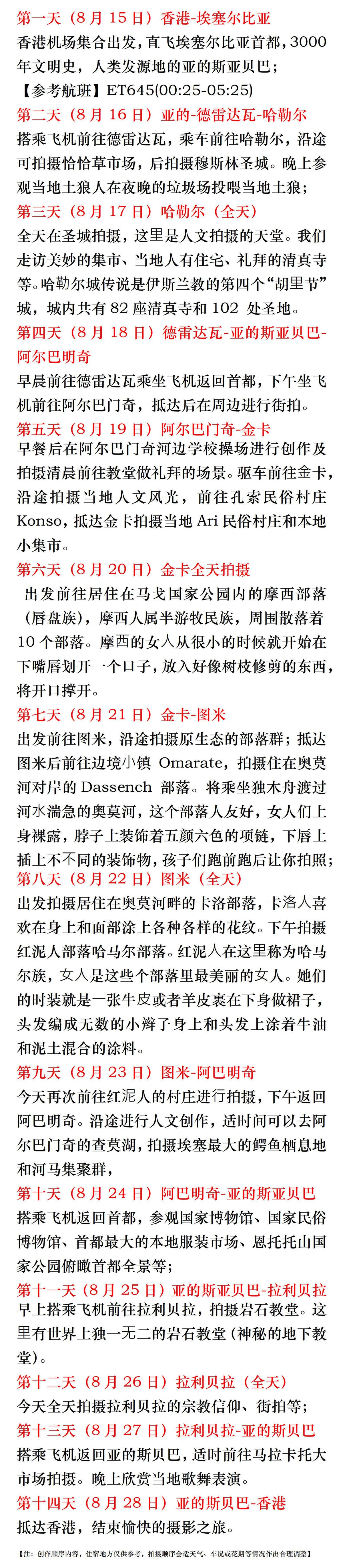 當?shù)剀囐M、埃塞俄比亞內(nèi)陸六程機票、全程餐費、住宿費(當?shù)刈詈?/span>)、簽證費、部落入場費、景點門票、攝影指導(dǎo)費、旅游意外險等;
